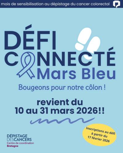 📢 Dans le cadre de Mars Bleu 2026, le Centre Régional de Coordination de Dépistage des Cancers en Bretagne (CRCDC Bretagne), en lien avec 10 autres CRCDC en France, organise un défi sportif connecté, gratuit et ouvert à tous.