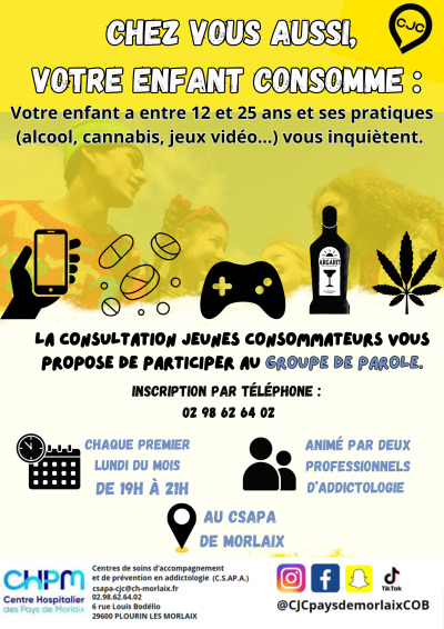 La Consultation Jeunes Consommateurs (CJC) et le CSAPA du CHPM proposent un groupe de parole mensuel (tous les premiers lundis du mois de 19h à 21h) à destination des parents et de l’entourage de jeunes de 12 à 25 ans, pouvant être concernés par des consommations ou des conduites à risques (alcool, cannabis, écrans, autres produits…).