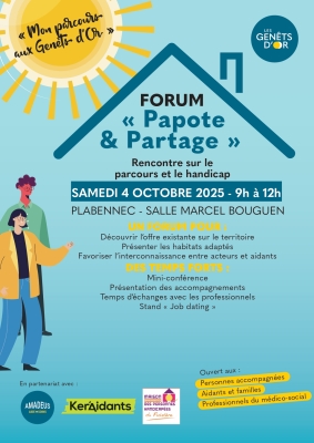 ✨ Les Genêts d'Or, en partenariat avec l'association AMADEUS Aide & Soins et l'association Ker'Aidants, organise un forum intitulé « Papote et partage – Mon parcours au sein des Genêts d’Or ».