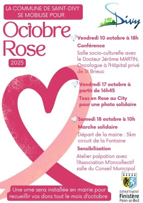 🎀 Saint-Divy se mobilise pour Octobre rose et organise une marche solidaire de 5 km, au départ de la mairie (circuit de la Fontaine).